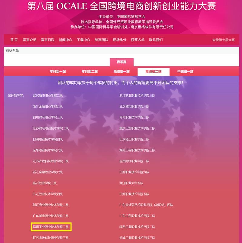 2022年第八(bā)屆OCALE全國跨境電(diàn)商創新創業能力大賽(春季(jì)賽)於2022年4月14日(rì)晚落(luò)下帷幕(mù)。常州工業職業技術學院20商務331班季羽彤、鄧天鎬(gǎo)、21商務631班楊鵬程組成的參賽一隊和21商務531班陳加成、21商(shāng)務631班唐穎、21商(shāng)務331班林若靜組(zǔ)成的參賽二隊(duì)披荊斬棘,分別以高職組一站第(dì)5名、高(gāo)職組二站第23名的好成績,獲兩項團體特等獎。
