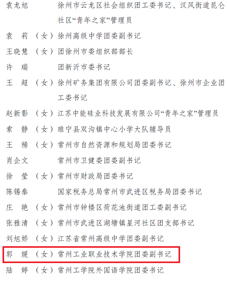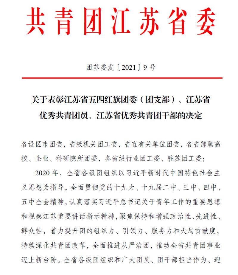 近(jìn)日,共(gòng)青團江蘇省(shěng)委(wěi)下發(fā)《關於表彰江(jiāng)蘇省五四紅旗團委(wěi)(團支部)、江(jiāng)蘇省優秀共青團員、江蘇省優秀共青(qīng)團幹部的(de)決定》(團蘇委發【2021】9號),我校信息工程學院18網絡631團支部被授(shòu)予2020年度“江(jiāng)蘇(sū)省五四紅旗(qí)團支部”稱號,我校團委副書記郭媛榮獲“江蘇省優秀共青團幹部”稱號(hào)。