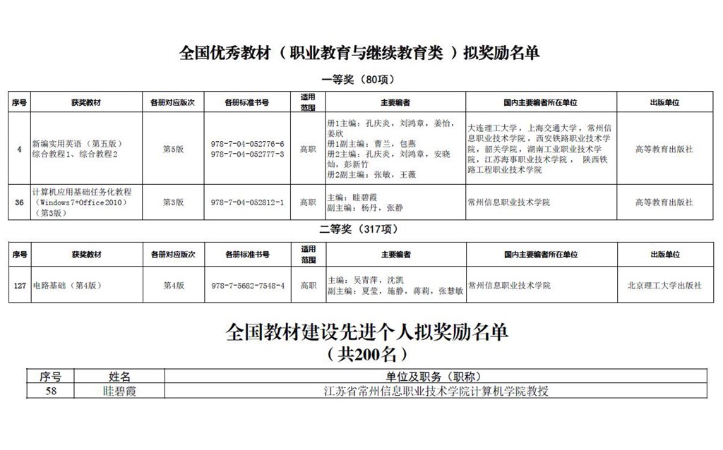 近日,教育部公示了首屆全國教材(cái)建設獎擬獎勵名單,我校校長眭碧霞(xiá)教授擔任主(zhǔ)編,張靜、楊丹(dān)擔任副主編的《計算機(jī)應用基礎任務化教程(Windows7+Office2010)》(第3版(bǎn))獲全(quán)國優秀教材(職業教育與繼續教育類)一等(děng)獎;吳青萍、沈凱擔任主編(biān),夏瑩、施靜、蔣莉、張慧(huì)敏擔任副主編(biān)的《電路基礎(第4版)》獲二等獎;曹蘭(lán)擔任副主編的《新編實用(yòng)英語(第五版)綜合教程1》《新編實用英語(第五版)綜合教程2》獲一等獎;眭(suī)碧霞獲(huò)全(quán)國教材建設先進(jìn)個人稱號(hào)。