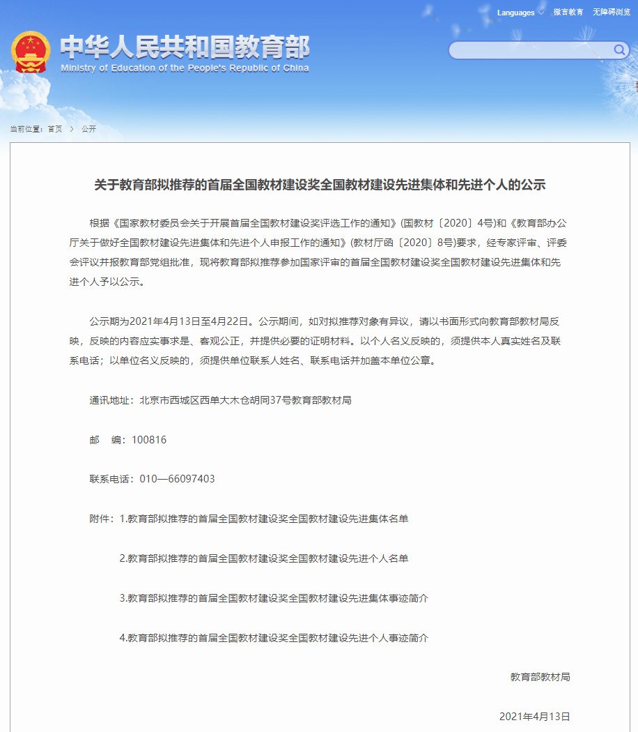 全國教材建設獎由(yóu)國家教材委員會主辦、教育部承辦,每4年評選一次,旨在對各級各類(lèi)優秀教材和作出(chū)突出(chū)貢獻(xiàn)的先進集體、先進個人予以表彰,立(lì)足強導向、建機製、促建設,充分調動各方麵(miàn)的積極性,帶動教材建(jiàn)設質量(liàng)整(zhěng)體(tǐ)提升。2020年開展的(de)首屆全國教材建設獎評(píng)選是新中國成立以來首次設立全麵覆蓋教材建設各(gè)領域的專門獎勵項目(mù),也是(shì)全國教材建設領域的最高獎。