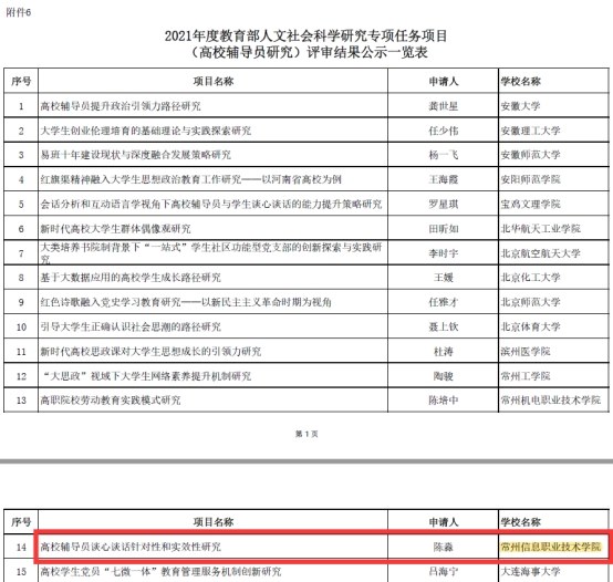 教育部社科司公示了2021年度教育部人文社會科(kē)學研究一般項目評審結果。我校軟件(jiàn)與大數(shù)據學(xué)院教(jiāo)師陳淼申報的《高校輔導員(yuán)談心談話針對性(xìng)和實效性研究》課題,獲教育部人(rén)文社會科學研(yán)究專項任務項目(高校輔導員研究)立項公示。本次全國(guó)共立項課題209項(xiàng),其中江蘇省獲立項課題25項,省內高職僅有6項,這是我校首次獲得此類(lèi)項目立項。