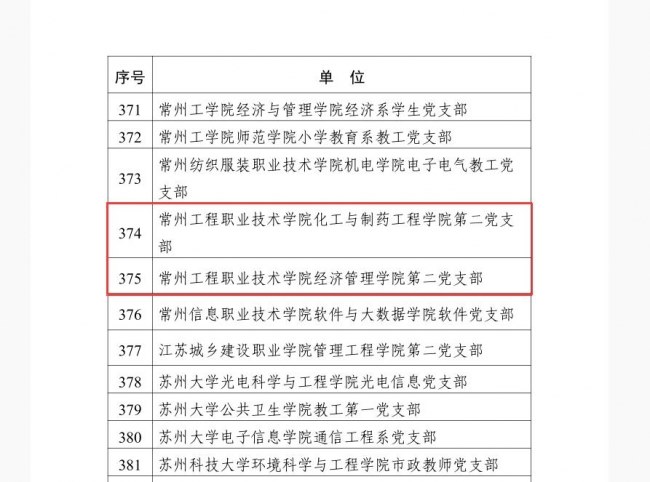 近日,江蘇省委(wěi)教育工委辦公室公布首(shǒu)批全省(shěng)黨建工作示範高校、標杆院係、樣板支部培育創(chuàng)建(jiàn)單位名單(dān),常(cháng)州工程職業技術學院化工與製藥(yào)工(gōng)程學院第二黨支(zhī)部、經濟管(guǎn)理(lǐ)學院第二黨支部入選首批全省黨建工作樣板(bǎn)支部培育創建單(dān)位。