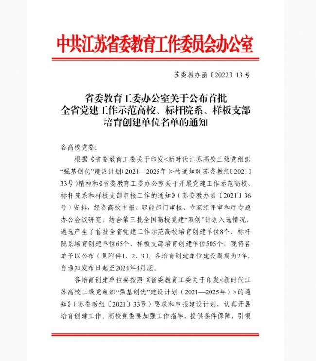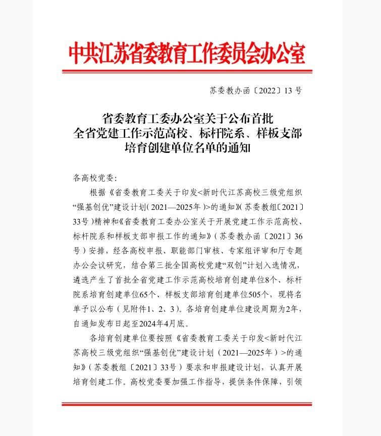 學校黨委積極貫徹落實《教育部辦公(gōng)廳關於開展第三批(pī)新時(shí)代高校黨建示範創建和質量創(chuàng)優工作的通知》《新時代江蘇高校三級黨組(zǔ)織“強基(jī)創優”建設計劃(2021—2025)》文件精神,對照建設要求,按照“五(wǔ)個到(dào)位”“七個有(yǒu)力”建設標準,通過抓書(shū)記、書記抓,以黨建考核為重點,以項目建設為載體,深化黨建工作機製,構建學校黨建工作體(tǐ)係,推動學校黨建工(gōng)作提質增效、強基創優(yōu)。