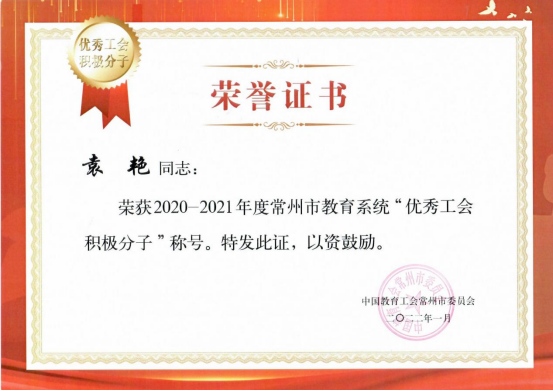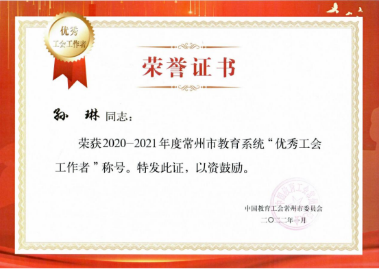 常州信息職業技術學院三位教師分別榮獲2020-2021年度常州市教育係統優秀工(gōng)會之友、優秀​工會(huì)工作者(zhě)、優秀工會積極分子稱號(hào)