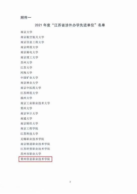 根據江蘇省(shěng)高等教育(yù)學會涉外辦學研究委員會公布《關於公布2021年度“江蘇省涉外(wài)辦(bàn)學工作(zuò)先進(jìn)單位”、“江蘇(sū)省涉外辦學工作先進(jìn)個人”評選結果的通知(zhī)》,常州信息職(zhí)業技術學院成功入選先進單(dān)位。全(quán)省高(gāo)校中共有26所(suǒ)學校入選先進單位(wèi),其中高(gāo)職(zhí)院(yuàn)校僅5所。