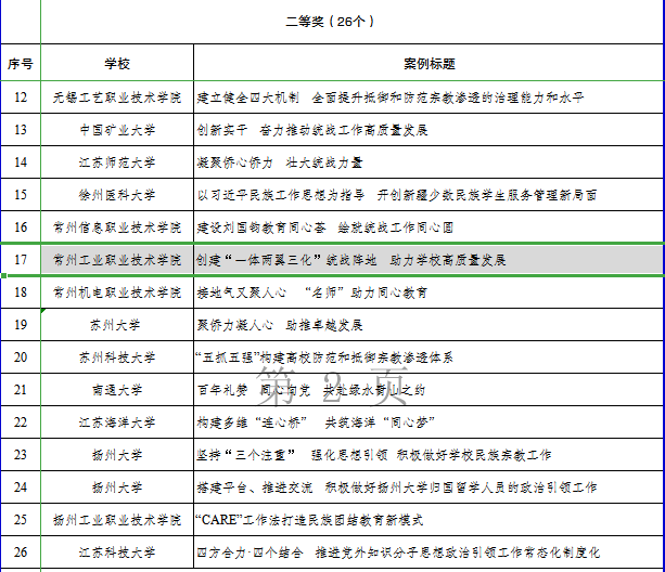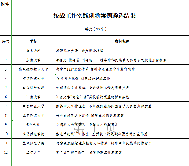 近日,江蘇省(shěng)委教育工委麵(miàn)向全省高校開展了“同心向黨·教育(yù)有(yǒu)我(wǒ)”統戰工(gōng)作實踐創新案例征集。經(jīng)學校申報、專家評審,全省最終遴選出68個優秀創(chuàng)新案例,其中一等獎12個、二等獎26 個、三等獎30個。我校黨委統戰部報送的《創建“一體兩翼三化(huà)”統(tǒng)戰陣地 助力學校(xiào)高質量(liàng)發展》案例榮獲二等獎,實現統戰工作(zuò)曆史性突破。