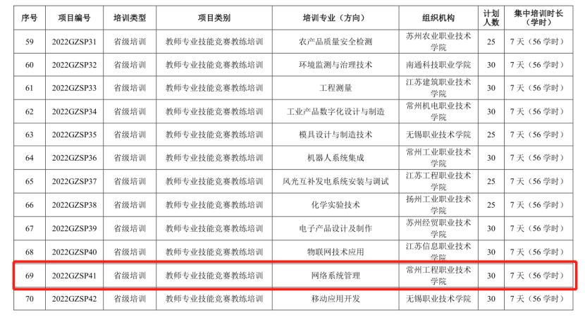 日前,江蘇省高等(děng)職業教育教師培訓中心和江蘇省(shěng)中等職業(yè)教育教師培訓中心分別發布《關於公布2022年江蘇省高職(zhí)院(yuàn)校教師(shī)國(guó)家級和省級培訓項目承擔單位的通知》和《關於公布2022年江蘇省(shěng)中等(děng)職業(yè)教育教師省級培訓項目基(jī)地名單的通知》,常州工程(chéng)職業技術學院獲批承擔江蘇省高職院校教師“專業技能競賽教練培(péi)訓(網絡係統管理)”和中職院校教(jiāo)師(shī)“技(jì)能大賽教練培訓(化工生產與分析技術”等2項省培項目。