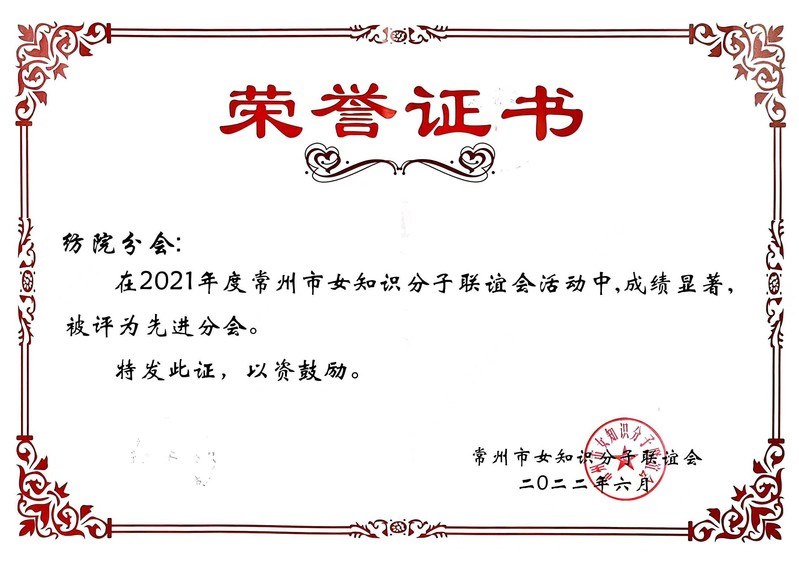常州紡織服裝職業技術學院女知聯(lián)榮獲常州市女(nǚ)知聯2021年度(dù)“先進分會”榮譽稱號(hào)