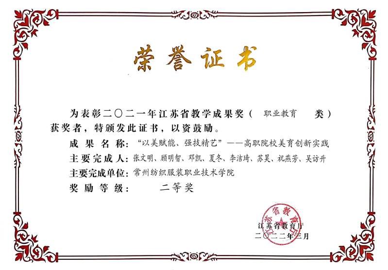 9、“以美賦能、強技精(jīng)藝”高職(zhí)院校美育創新實踐獲江蘇省教學成果二等獎。
