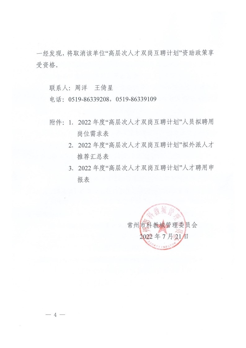 常州市科(kē)教城(chéng)管理(lǐ)委員會關於組織實施2022年(nián)度“高層次人才雙崗(gǎng)互聘計劃”的(de)通知