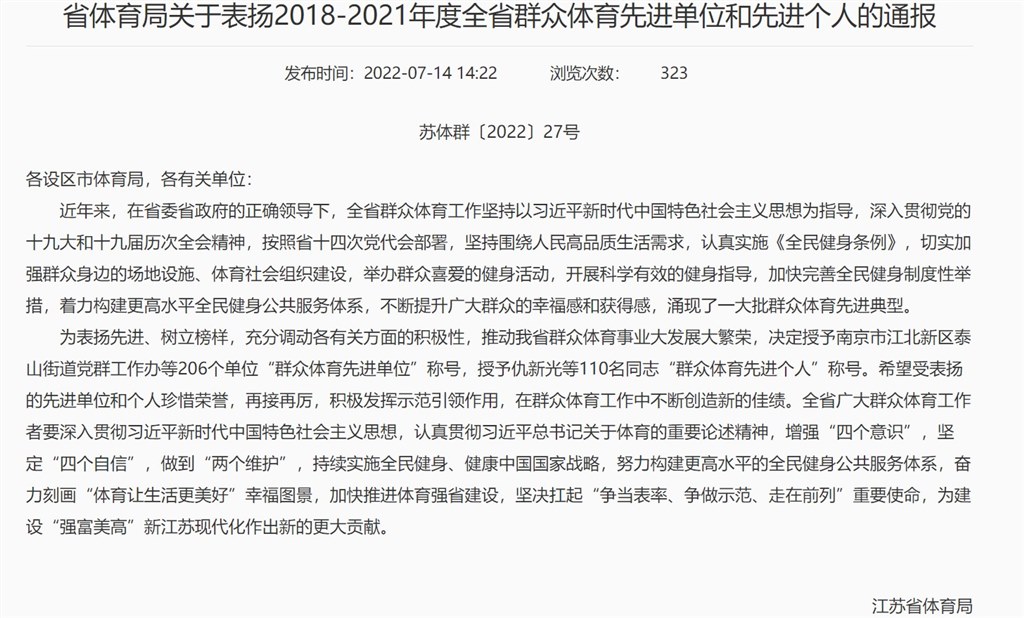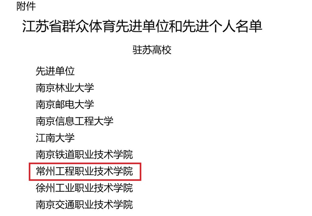 近日,江蘇省(shěng)體育局發布《省體育局關於表揚(yáng)2018-2021年(nián)度全(quán)省(shěng)群(qún)眾體育先進單位和先進個人的通報》(蘇體群〔2022〕27號),常州工程職(zhí)業技術學院榮獲“江蘇省群眾體育先進單位”稱號。全省高校係統共有8所院校(xiào)獲此表彰。