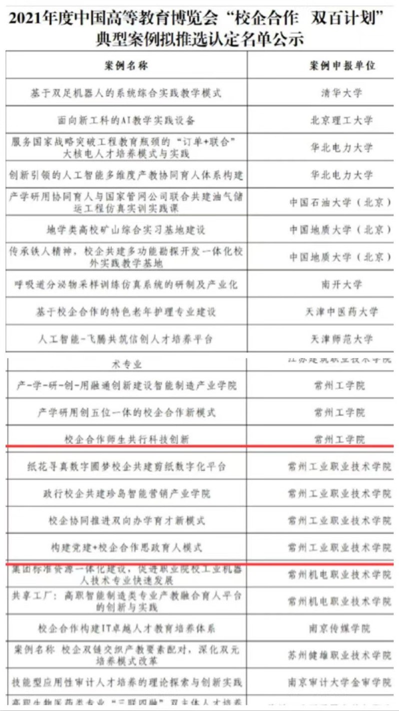 為貫徹落實黨的十九屆五中全會精神,全麵落實《國務院(yuàn)辦公廳關於深化產教融(róng)合的(de)若幹意見》精神,根據《關於啟動2021年度中(zhōng)國高等教育博覽會(huì)“校企合作 雙(shuāng)百計劃”工作的通知》要求,近日,中國高等教(jiāo)育學會評選出260項(xiàng)案例為2021年度(dù)中(zhōng)國高等教育博覽會“校企合作 雙百計劃”典型案例,常州工業職(zhí)業技術學院推薦的4項案例均榜上(shàng)有名,上榜數量位居全國高職院(yuàn)校首位。