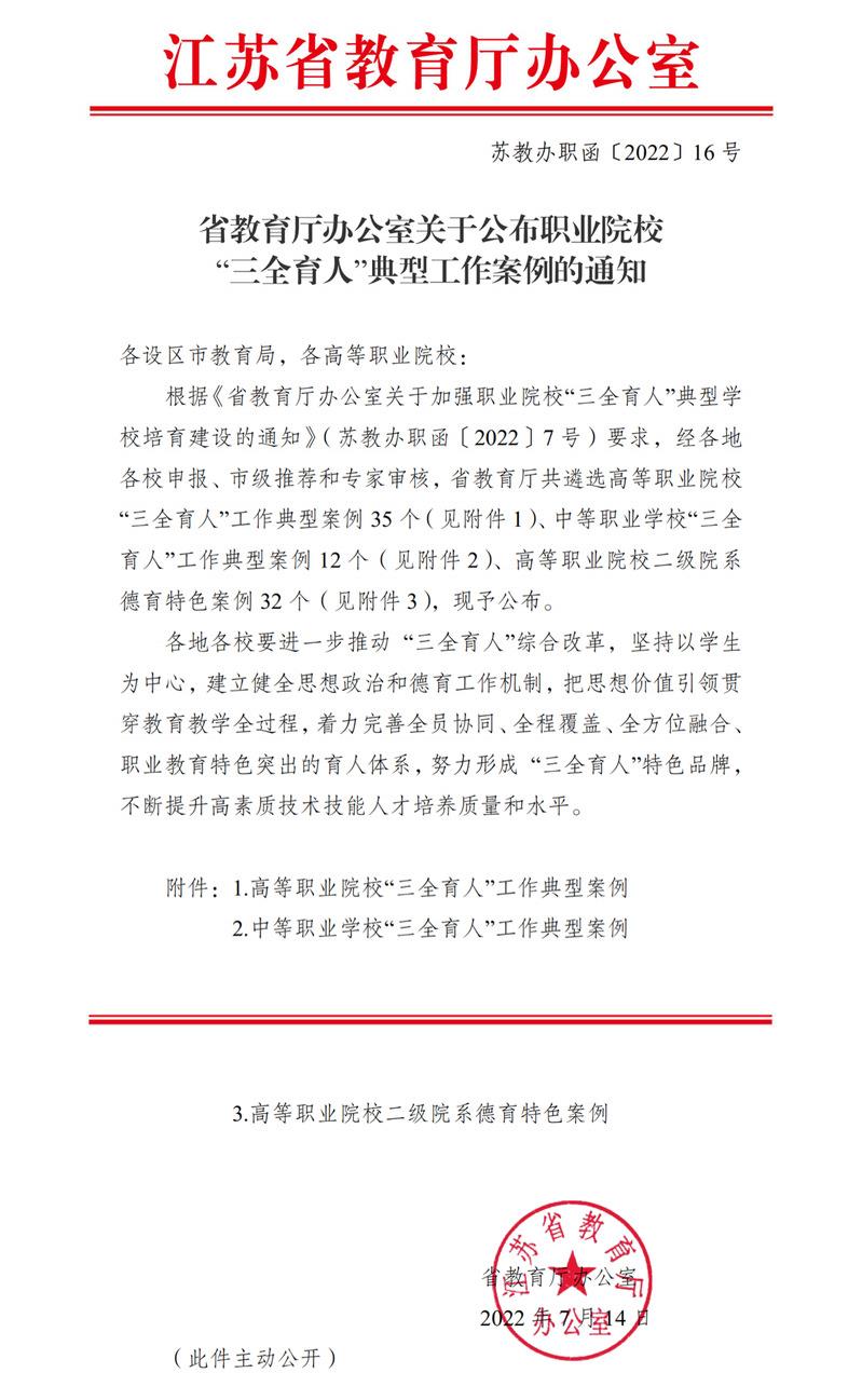 近日,省教育廳發布《省教育(yù)廳辦公室關於公布職業院校“三全育人(rén)”典型工作案例的通知》(蘇教辦職函〔2022〕16號),公布職業院校“三全育人”典型工作案例評審結(jié)果。常州機電職業(yè)技術學院申報案例(lì)《雙輪驅動 四維並進—“三(sān)全育(yù)人”綜合改革創新實踐》獲評高(gāo)等職業(yè)院校“三(sān)全育人”典型工作案例,機械工程學(xué)院申報的案例《雙融合三階段四引(yǐn)領 “導師製”撬動“大格局”》獲評(píng)高等職業院校二級院係德(dé)育特(tè)色案(àn)例。