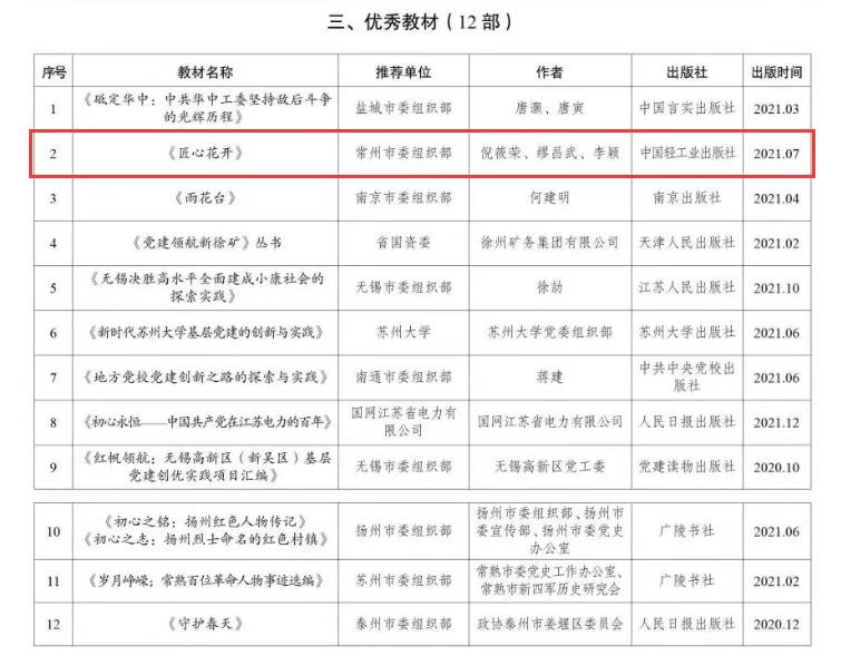 近日,江蘇省黨員(yuán)教育培訓(xùn)教材展示(shì)交流活動評選結果公布,常州(zhōu)市委組織部選送的兩部書籍獲獎,其中常州工業職業技術學院的(de)校本文化教材《鄧建軍的校友們(men)(第一輯)·匠心(xīn)花開》獲評“優秀教材(cái)”。