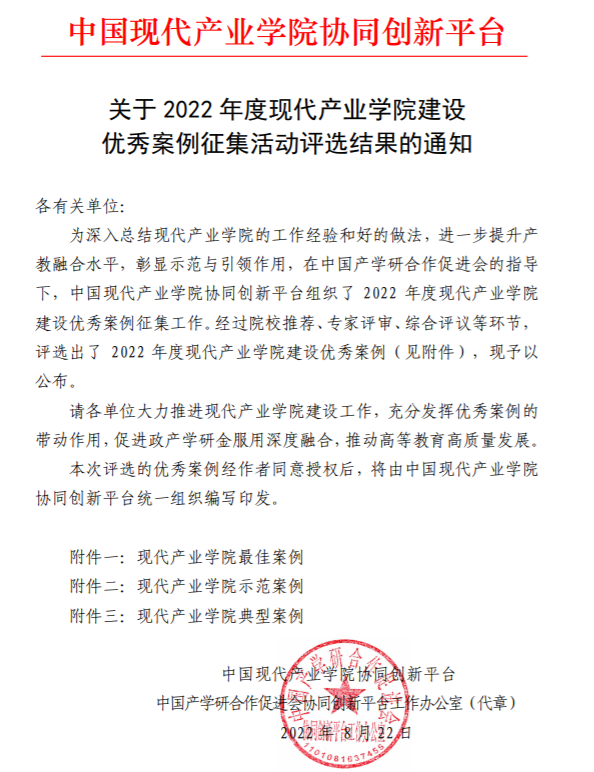 為深入總結(jié)現(xiàn)代產業學院(yuàn)的工作經驗和做法,進一(yī)步提(tí)升產教融合水平,彰顯示範與引領作用,中國現代產業學院協同創新平台組織了2022年度(dù)現代產業學院建設優(yōu)秀案例征集工(gōng)作,經過院校推薦、專家評審、綜合評(píng)議等環節(jiē),共評(píng)選出了 2022年度現代產業(yè)學院(yuàn)建設優秀(xiù)案例,其中最佳案例7個,示範案例21個,典(diǎn)型案例39個。