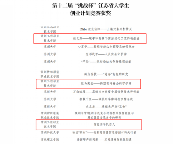近日,由共青團江蘇省委、江蘇省教育(yù)廳等部(bù)門主辦的第十二(èr)屆“挑戰杯”江蘇省大學生創業計劃競賽決賽成績公布。常(cháng)州工程職業(yè)技術學院《綠之源—碳中(zhōng)和背景下清(qīng)潔(jié)鹵代工藝領航者》獲得省(shěng)賽金獎,《驅(qū)鳥魔(mó)盒-高空電網安全的守護神》獲得省賽銀獎,《智能泊車機器人》獲得省賽銅(tóng)獎。其中《綠之源—碳中和背景下清潔鹵代工藝領航(háng)者》作品成功入圍第十三屆“挑戰杯”中國大學生創業計劃競賽全國決賽終評,國賽擬於今年11月在北京舉行。
