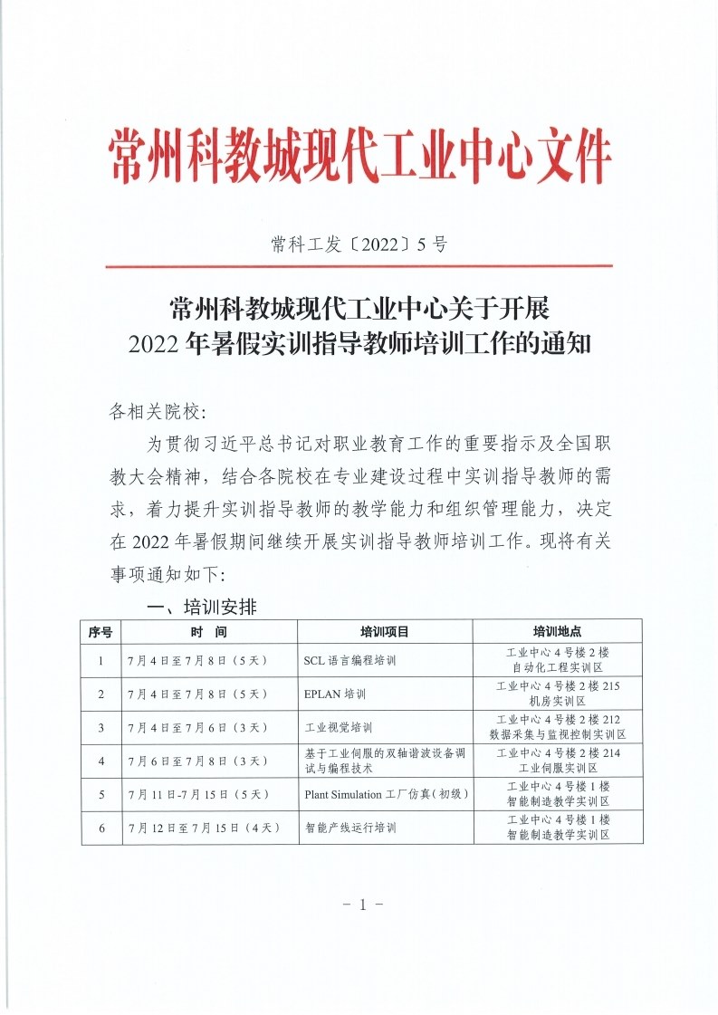 常州科教城現代工業中心關於開展2022年暑假實訓指導教師培訓工作的通知