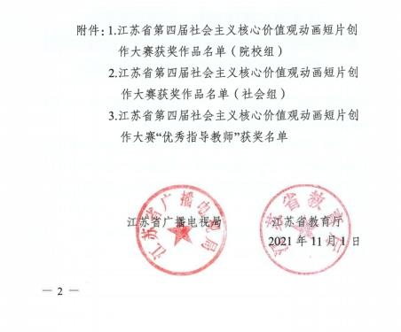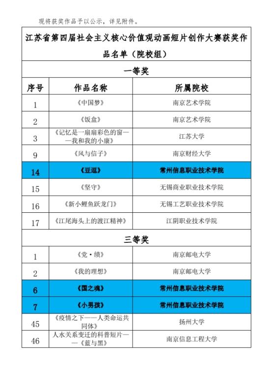 近日,由江蘇省廣播電視局、江蘇省教育廳聯合舉辦的江蘇省第四屆社會主義核心價值觀動畫短(duǎn)片創作(zuò)大(dà)賽獲獎名(míng)單公(gōng)布,本(běn)次大(dà)賽集合了全省本科、專業院校的動畫短片創作,我校參賽作品脫(tuō)穎而出,榮獲一等獎一項,三等獎兩項,是常州(zhōu)唯一獲得一等獎的高校。