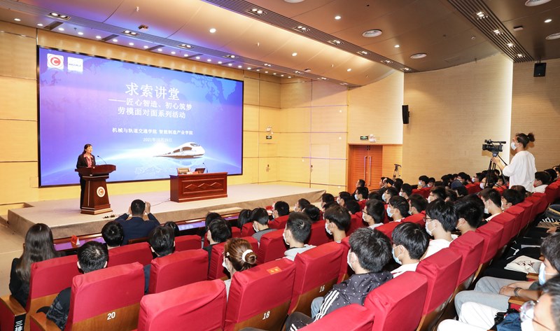 為引領學生在學習中成長,在學習中感悟工匠精神,10月29日,機械與軌道交通學院 智能製造產業學院在科(kē)教城(chéng)校(xiào)區文彰樓報告廳開展(zhǎn)“求索講堂”之——“匠心智造、初心築夢”勞模麵對麵係列活動。中(zhōng)車唐山機車車(chē)輛有限公司首席技能專家、全國勞動模範張雪鬆為同學們作“在學習中成長”報告。學院相(xiàng)關負責人、全(quán)體輔(fǔ)導員及學(xué)院“青馬工程”第九期全體學員參(cān)加報告會。