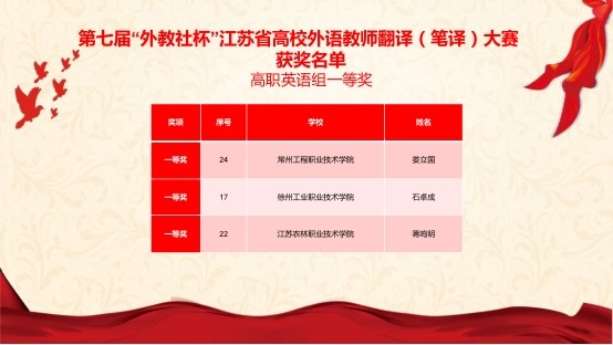 1126-27日,由江蘇省翻譯協會、江蘇省高等學(xué)校外國語教學研究會和上海外語教育出版社聯合舉辦的第七屆“外教社杯”江蘇省高校外語教師翻譯(筆譯)大賽成功舉行我校通識教育教學(xué)部英語教師婁立國(guó)以第一名的成績斬獲高職組一等獎。此為今年該賽項最高(gāo)獎項,也是婁立國老師繼2020年在該賽事獲得“特等獎”之後第二次摘得該賽事最高獎項。