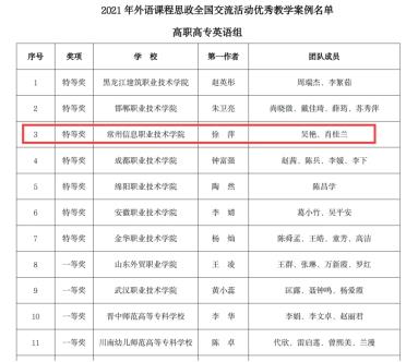 近日,由教育部(bù)職業院校外語(yǔ)類專業教學指導委員會、高等教育出(chū)版社、全國高校教師網絡培訓中心和《中國外語》編輯部聯合舉辦的“2021年(nián)外(wài)語課(kè)程思政優秀案例全國交流活動”公布評審結果。我校大學外語部教師(shī)團隊徐萍、吳豔、肖桂蘭榮獲高職高專英語組全(quán)國特等獎。
