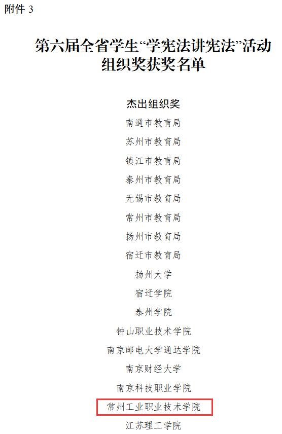 近日,江蘇(sū)省(shěng)教育廳公布(bù)了第六屆全(quán)省學生“學憲法 講(jiǎng)憲法”活動結(jié)果(guǒ),根據“學憲法講憲法(fǎ)”活動開展情況,特別是“憲法衛士”2021年行動計劃參與情(qíng)況,授予(yǔ)全省24個單位(8個教育局,16所本科(kē)、5所高職院校)獲傑(jié)出組織(zhī)獎,22個單位獲優秀組織獎。我校活動開展(zhǎn)情況(kuàng)成績突出,榮獲傑出組織獎。