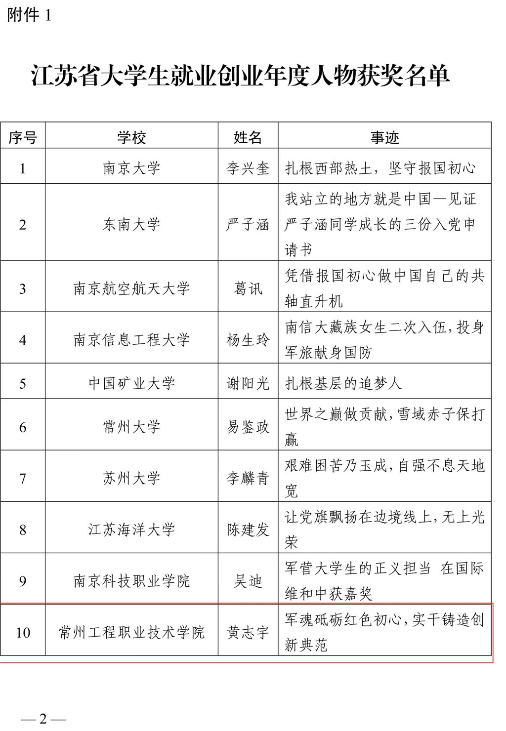 近日,江蘇省大學生(shēng)就業創業年度(dù)人物評選活動結果揭曉,常州工程職業技術學院2022屆物聯網應用技術專業畢業生黃(huáng)誌宇榮獲年(nián)度人物榮譽稱號。
