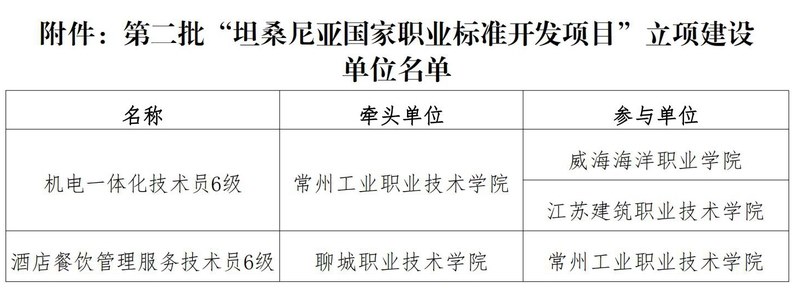 近日(rì),中(zhōng)非職業教育聯盟公布“坦桑尼亞國(guó)家職業標準開發項目”第(dì)二批立(lì)項建設單位名單,常州工業職業技術學院機電一(yī)體化技術員6級、酒店餐飲管理服務技術員6級兩項專業(yè)標準(zhǔn)入選。