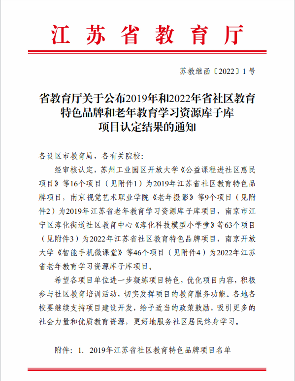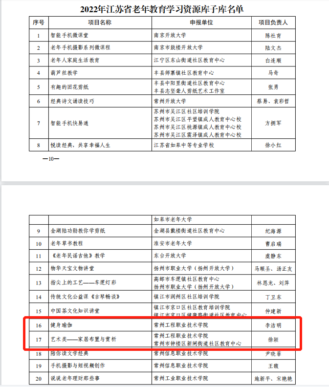 近(jìn)日(rì),江蘇省(shěng)教育廳公布 2019年和2022年省社區教(jiāo)育(yù)特色品牌項目和老年教育學(xué)習資源庫子庫項目認定結果的通知(蘇(sū)教繼函〔2022〕1號)。常(cháng)州工程職業技術學(xué)院(yuàn)申報的“地方傳統(tǒng)工藝技藝實踐體驗”和“平安之家大講堂”成功入選2022年度(dù)江蘇省社區教育特色品牌(pái)建設項目,“健身瑜伽”和“藝術類——家居布置與賞析”成功入(rù)選2022年度(dù)江蘇省(shěng)老年教育學習資源庫子庫項目。
