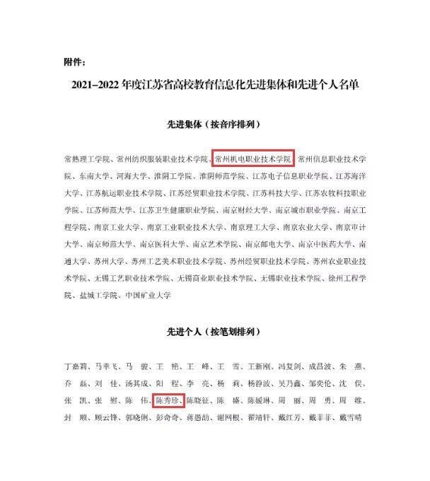 近日,江蘇省高等學校教育(yù)信息化研(yán)究會發布《關於2021-2022年度江蘇省高(gāo)校教育信息化(huà)先進集體、先進個人(rén)評選結果的通知》,常州機電職(zhí)業技術學院再(zài)獲“高(gāo)等學校教育信息化先進集體”,教務處陳秀珍獲(huò)評先(xiān)進個(gè)人。