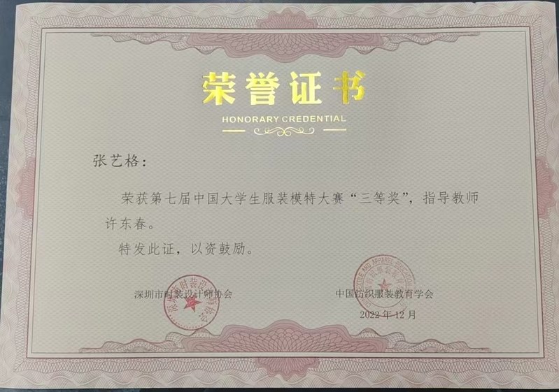 12月24日晚,第七屆中國大學生服(fú)裝模特大賽總決賽在深圳落下帷幕。來自全國(guó)54所院校82位選手進入(rù)總決賽(sài),總決賽選手以本科(kē)院校學生為主,綜合實力(lì)非常強,經過知(zhī)識問答、泳裝、禮服、休閑服等環節的激烈角逐,最終,常(cháng)州紡織服裝職(zhí)業技術學院選手服裝(zhuāng)學院服設203A張藝格同學取得(dé)了三等獎的好成(chéng)績。