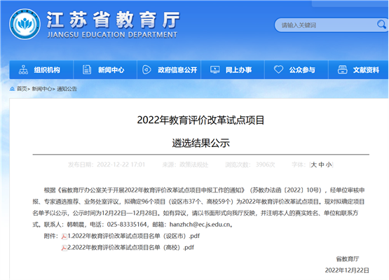 近日,教育廳發布(bù)《2022年教育評價改革試點項目遴選結果公示》,常州工程職業技(jì)術學院《理念引領 機製驅動 數據賦能——以適合的教(jiāo)育引領教育評價綜合改革》入選2022年江蘇省教育評價改革(gé)試點項目。據悉,本次教育廳共計確定96個項目(設區市37個、高校59個)為2022年教育評價改革(gé)試點項目,學校申報項(xiàng)目為高校入選項目中為數不多的綜合改革項目。