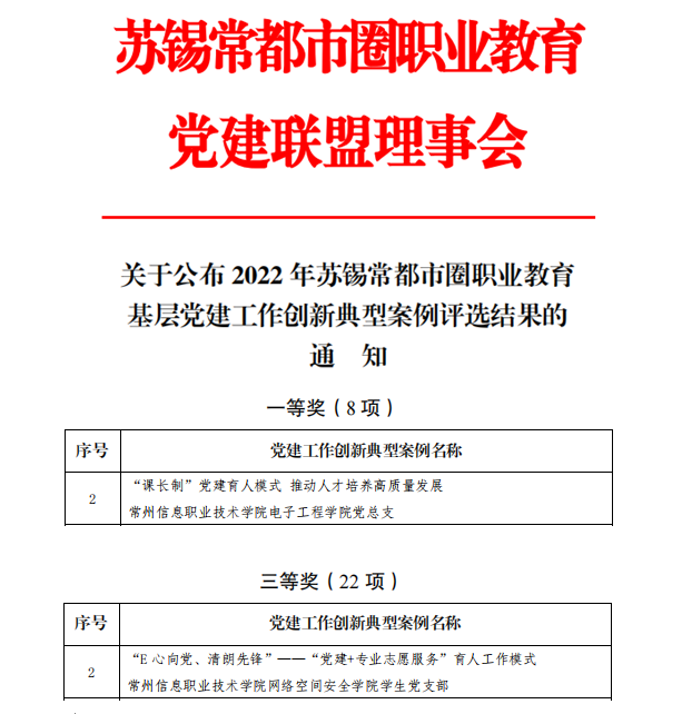 近日,蘇錫常都市圈職業教育黨建聯盟理事會(huì)公(gōng)布了(le)2022年(nián)蘇錫常都市圈職業教育基層(céng)黨(dǎng)建工作創新典型案例評選結果,常州信(xìn)息職業技術學院電子工程學院黨總支報送的(de)《“課長製”黨建育人模式推動人才培養(yǎng)高質(zhì)量(liàng)發展(zhǎn)》獲得一等獎,網絡空(kōng)間安全學院黨總支報送的《“E心向黨、清(qīng)朗先鋒”——“黨建+專業誌願服務”育人工作模式》獲得(dé)三等獎(jiǎng)。