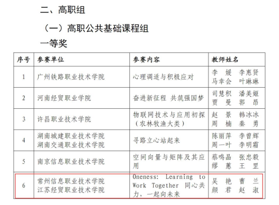 近日,2022年全國職業院校技能大賽(sài)教學能力比賽傳來喜訊,常州(zhōu)信息職業(yè)技術學院大學(xué)外語部吳(wú)豔和曹蘭團隊與來(lái)自江(jiāng)蘇經貿職業技術學院的教(jiāo)師代表,共同披荊斬棘、凱歌前行,憑借作品《Oneness: Learning to Work Together同心共力,一起向(xiàng)未來》榮獲高職公共基礎課程組一等獎。這也是學(xué)校繼去年之後,再獲全國(guó)職(zhí)業院校技能大賽教學能力比賽(sài)一等獎,斬獲(huò)兩連冠。