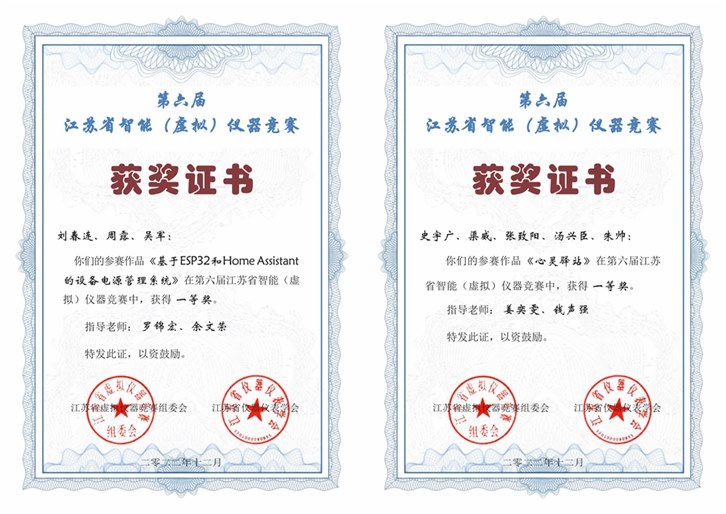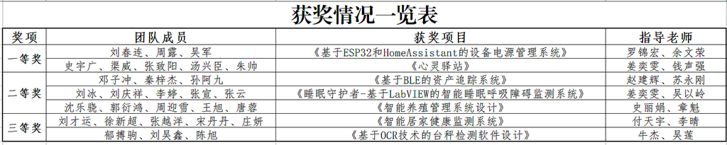 劉(liú)春連、周露(lù)、吳軍(jun1) 《基於(yú)ESP32和Home Assistant的設備電(diàn)源管理係統》,史宇廣、渠威、張致陽、湯興(xìng)臣、朱帥 《心靈驛站》獲一等獎;鄧子衝、秦梓傑、孫阿九 《基於BLE的資產追(zhuī)蹤係統》,劉冰、劉慶祥、李婷、張宣、張雲《睡眠(mián)守護者-基於LabVIEW的智能睡眠(mián)呼吸障礙監(jiān)測係統》以(yǐ)及沈樂驍、郭衍(yǎn)鴻、周(zhōu)迎(yíng)雪(xuě)、王旭、唐蓉《智能養殖管理係統(tǒng)設計》獲二等獎;劉才運、徐(xú)新超、張越洋、宋丹丹、莊妍《智能居家健康監測係統》,鬱搏駒、劉吳鑫、陳旭《基於OCR技術的(de)台秤檢測軟件設計》獲三等獎(jiǎng)。