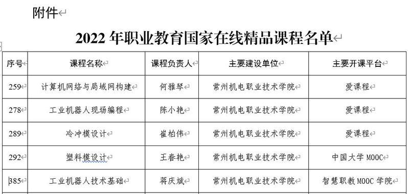 近日,教育部辦公廳公布了2022年職業教育國家在線精品課程名單,共認定1160門課程為2022年職(zhí)業教育國家在線精品課程。常州機電職業技術學院《計算機網絡與(yǔ)局域網構建》(課程負責人:何雅(yǎ)琴)、《工業機器人現場編程》(課程負責人:陳小豔)、《冷衝模(mó)設(shè)計》(課程(chéng)負責(zé)人:崔柏偉)、《塑料模設計》(課程負責人:王春(chūn)豔)、《工業機器人技術(shù)基礎》(課程負責(zé)人:蔣慶斌)等5門課程被認定為2022年職(zhí)業教育國家在線精品課程。