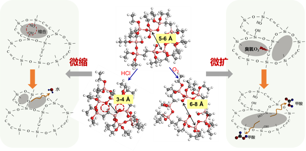 基(jī)於雜化矽結構中(zhōng)的羥基和橋聯(lián)基團的反應特(tè)性,研究團隊發明了鹽酸蒸汽和臭氧水溶液孔道改性技術,實現了膜有效孔徑(jìng)的原位微縮和微擴(圖2),顯著提高了溶劑回收和鹽水分離應用中膜的選擇性和滲透(tòu)通(tōng)量。