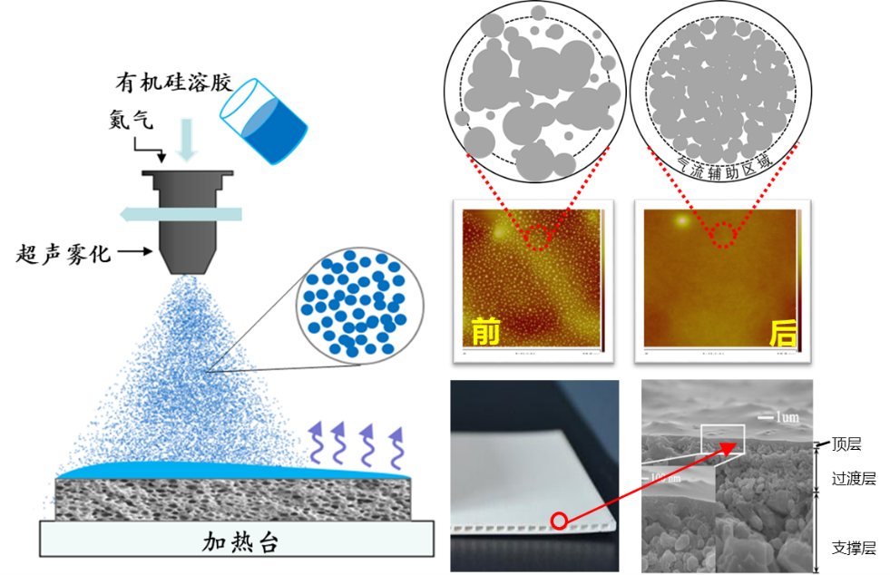 圍繞(rào)上述關鍵共性(xìng)問題,常大石油化工學院鍾璟教授團隊開發了超聲霧(wù)化熱噴塗技術,利用超聲波將矽溶膠(jiāo)霧(wù)化成高質量的均勻細小液滴,通過(guò)載氣輸送到無機陶瓷撐體上,有(yǒu)效減少矽溶膠內滲現象(xiàng),成功製備出超薄無缺陷有機-無機雜化矽微孔膜(mó);通過對超聲波噴塗高度和噴頭結構等關鍵參數(shù)的優化設計,實(shí)現了對膜完整性和均一(yī)性的(de)精準控製(圖(tú)1)。