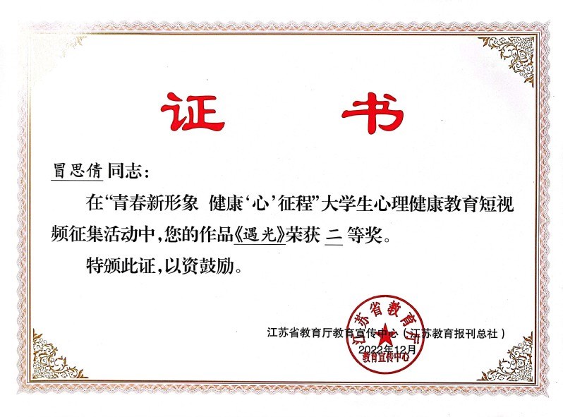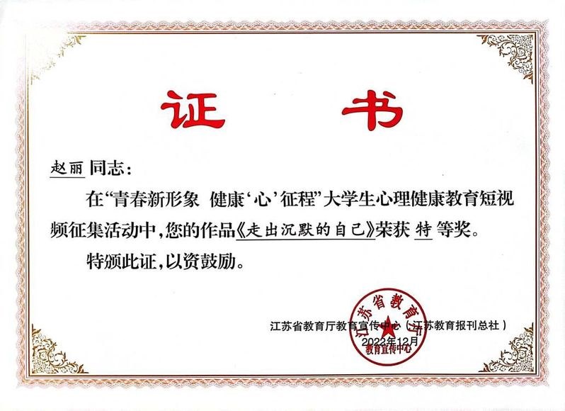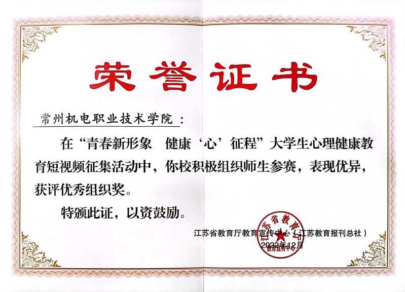 近日,由(yóu)省教育(yù)廳教育宣傳中心(江(jiāng)蘇教育(yù)報刊總社)主辦的“青春新形象 健康(kāng)‘心’征程”大學(xué)生(shēng)心理健康教育短視頻征集活動評選結果(guǒ)公布。常州機電職業技術學院選送的作品獲佳績,其中,信息工程學院物聯網2132班趙麗的作品《走出沉默(mò)的自己》(指導老師(shī)蔡蓉蓉)獲(huò)特等獎,經濟(jì)管理學院市場營銷2132班(bān)冒思倩的作(zuò)品(pǐn)《遇光》(指導老師馮超)獲二等獎(jiǎng),學校獲“優秀組織獎”。