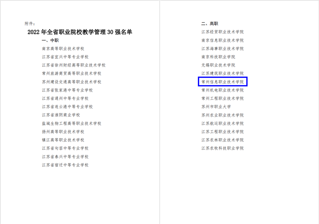 2月14日,江蘇省職業技術教育學會發布了《關於公布2022年全(quán)省職業院校教學管理30強(qiáng)遴選結果的通知》(蘇職學會〔2023〕1號),常州信息職業技(jì)術學院榮獲(huò)2022年全省職業院校教學管理(lǐ)30強。