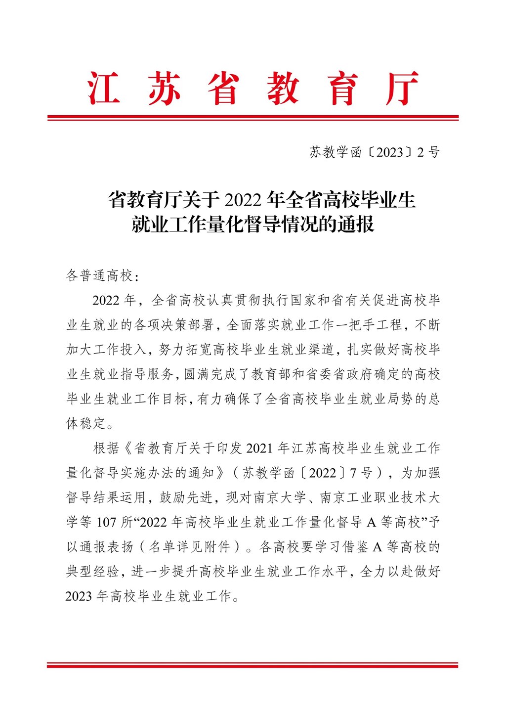 2022年,學校堅持將就業工作作為立德樹人的重要(yào)抓手,認(rèn)真貫徹執行國家和江蘇省促進高校畢(bì)業生就業(yè)的各項決策部署,全麵落實就業工作一把手工程,深入開展書記校長訪企拓崗促就業專項行動,積極應對就業(yè)工作(zuò)中的困難與挑戰,做到校園(yuán)雙選會和網絡招聘會有效銜接。細化校內就業工作量化督導實施辦法(fǎ)和就業質量考核指標,統籌(chóu)聯動、拓寬渠道、積極引導、優化服務,經全校共同努力,圓滿完成了(le)年度就業工作目標。
