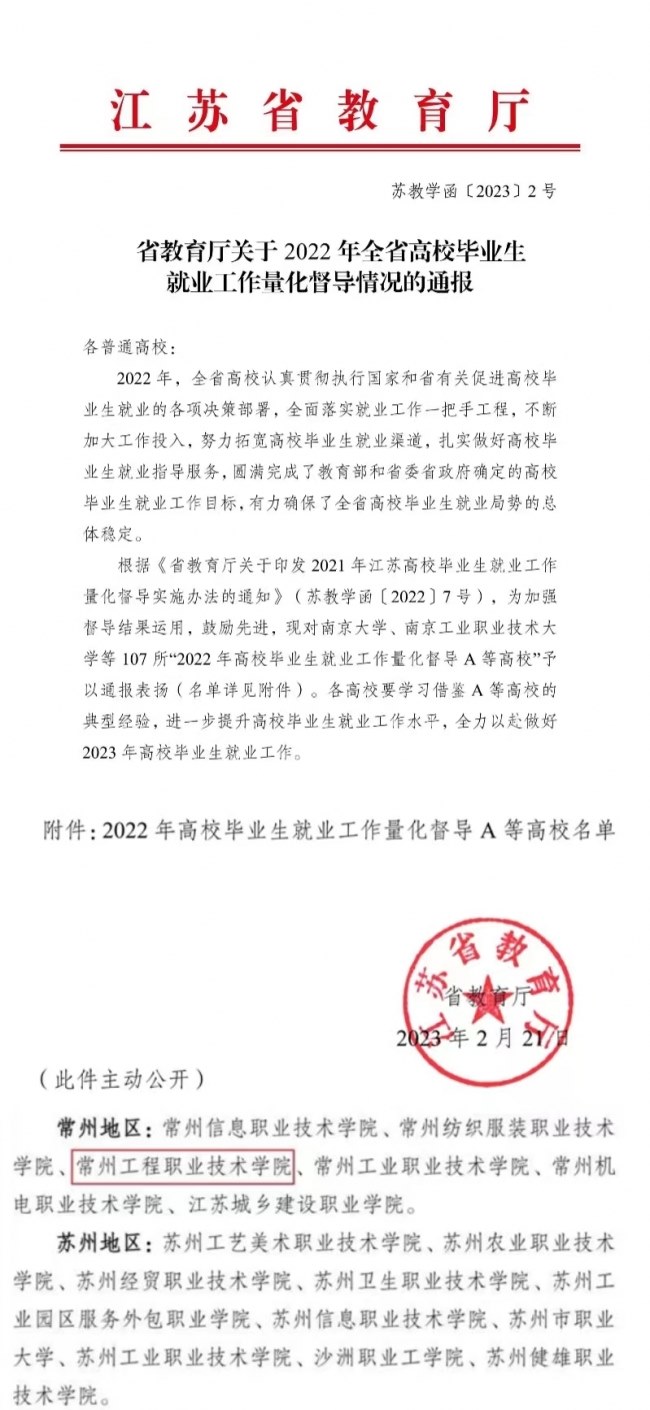 近日,江蘇省教育廳發布了《關於2022年全省高校畢業生就(jiù)業工作量化督導情況的通報》,常州工程(chéng)職業技術學院被評為江蘇省“2022年高校畢(bì)業生就業工作量化(huà)督導A等高校”,這也是學(xué)校連續三年獲得“A等高校”。
