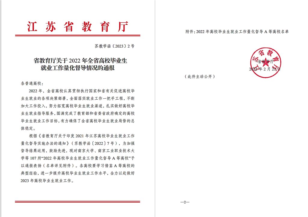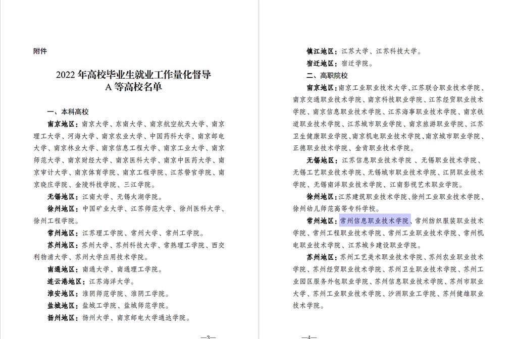 近日,江蘇省教育廳下發《省教育廳關於2022年全省高校畢業生就業工作量化督導情況的通(tōng)報》(蘇教學函〔2023〕2號),常州信息職業技術學院獲評2022年高校畢業生就(jiù)業工作量化督導A等高校,這也是學校連續第三年獲評該項榮譽。