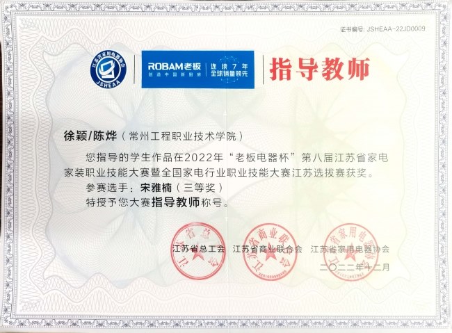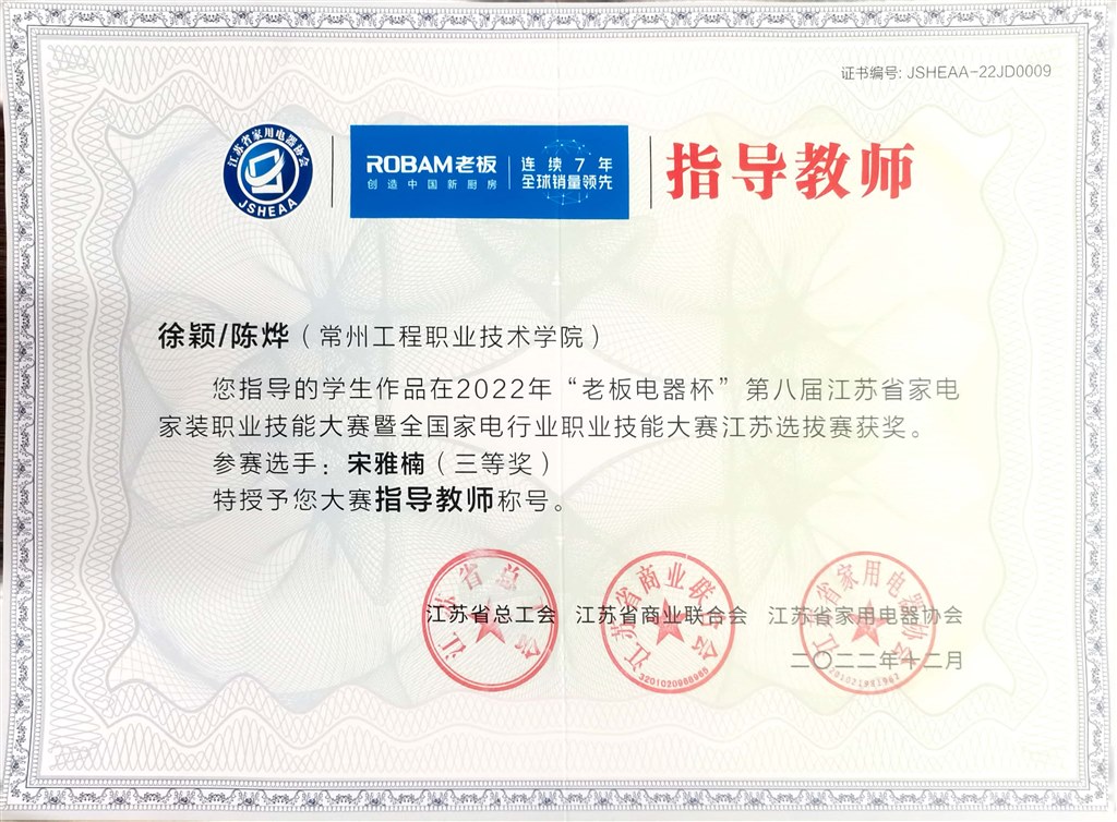 為推進“十四五”高技能人(rén)才發展規劃實施,我(wǒ)省家電家裝(zhuāng)行業開展(zhǎn)“江(jiāng)蘇工匠”崗位練兵職業技能(néng)競賽活動。在(zài)由江蘇省家用電(diàn)器協會和江蘇省財貿輕紡工(gōng)會聯合舉辦的2022年“老板電器杯”第八屆江蘇省家電家裝職業技能大(dà)賽暨全國家電行業(yè)職業技能大賽江(jiāng)蘇選拔賽中,陳國鋒老師獲得職工(gōng)組總(zǒng)成績第(dì)二名,宋亞楠等同學獲得(dé)學生組三等獎等榮譽(yù)。陳國鋒老師因成績突出,被授予“江蘇省技術能手”“江蘇省五一創新能手”榮譽稱號。