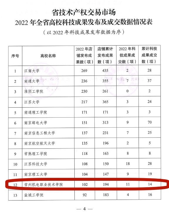 3月7日,由江蘇省科技廳主辦的2023年度江蘇省技術轉移(yí)工作總結會議在江蘇(sū)省會議中心召開,發布了2022年(nián)全省高校技術轉移工作成效相關數據。常州機電職(zhí)業技術學院2022年發布科技成果102項(xiàng),成交11項,獲批(pī)產(chǎn)業副總7人、揭榜掛帥合作項目7項,科技(jì)成果發布及成交業績位列(liè)全省高校第12位、全省(shěng)高職院校首位。