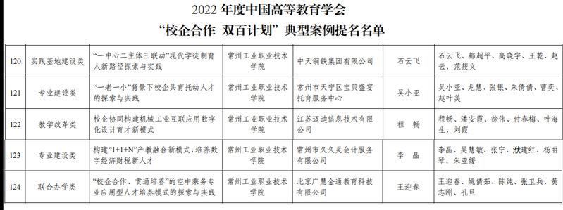 近日,中國(guó)高等教育學會(huì)公布了2022年度“校(xiào)企合作 雙百(bǎi)計劃”典型(xíng)案例提名名(míng)單,經資格(gé)審核、網絡推選、學會研究,共推(tuī)選產生359項提名典(diǎn)型案例,常州工業職業(yè)技術學(xué)院5項案例入選。