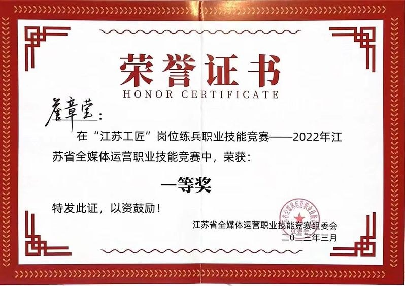 3月28日,由江蘇省人力資源和社會保障廳舉辦的“江蘇工匠(jiàng)”崗位練兵職業技能競賽活動——2022年江蘇省(shěng)全媒體運營職業技能總決(jué)賽在江蘇南通舉行。常州工業職業技(jì)術學院數字商務學院(yuàn)國際商務專業20商務331班學生詹章瑩獲全省總決賽(sài)一等獎、季羽彤獲三等(děng)獎。