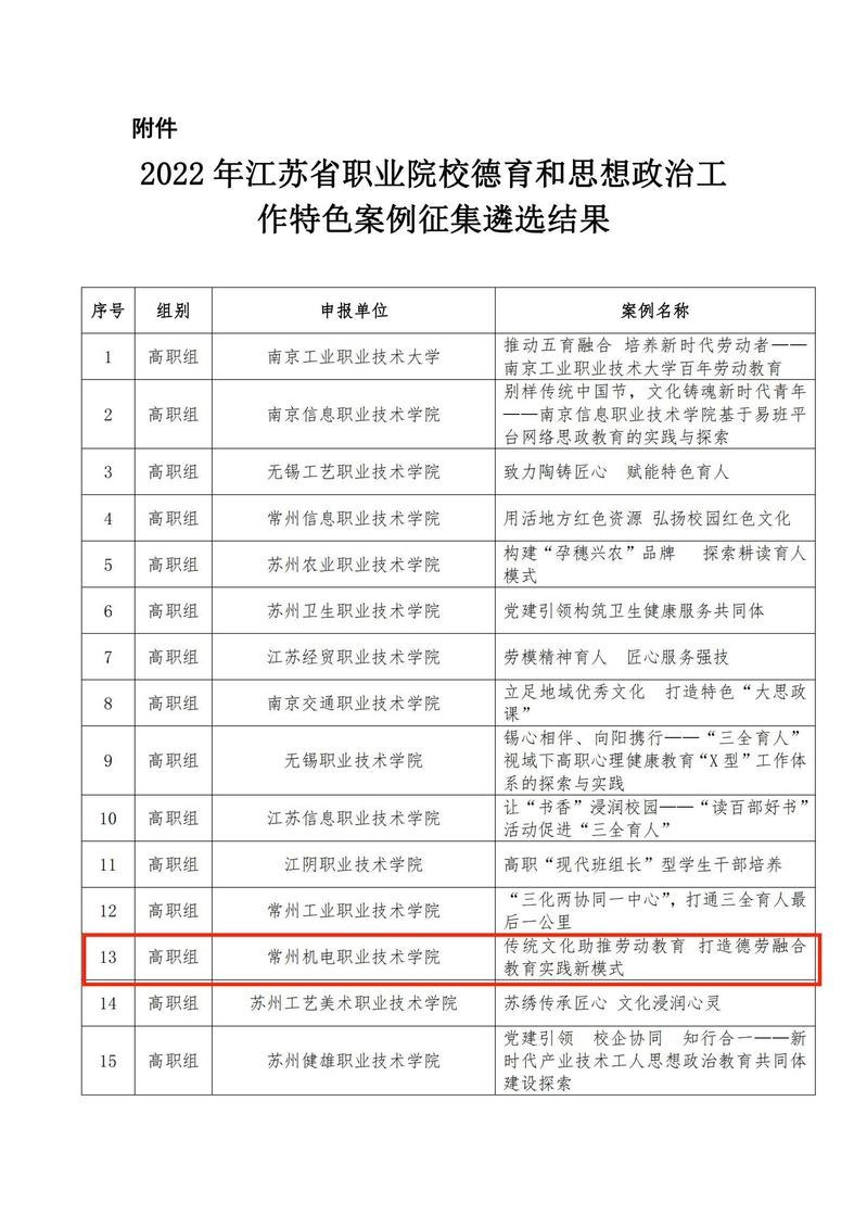 4月17日,江蘇省職業技術教育學會對2022年江蘇(sū)省職業院校德育和思想政治工作特(tè)色案例入選名單進行公示,常州機電(diàn)職業技術學院選送的機械(xiè)工程學院案例《傳統文化助推勞動教育打造德(dé)勞融合教育實踐(jiàn)新模式》入選。