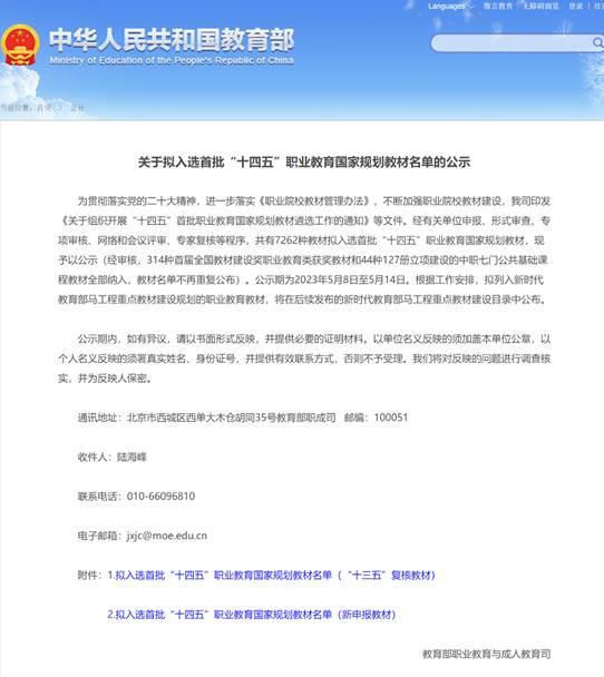 近日,教育部發(fā)布了《關於擬入選首批“十四五”職業教育國家規劃教材名單的公(gōng)示》。公示顯示(shì)共有7262種教材擬入選首批“十四(sì)五”職業(yè)教育國家規劃教材。常州信息職(zhí)業技(jì)術學院3部首屆全國教材建設獎職業教育(yù)類獲獎教(jiāo)材、19部“十三五”職業教育國家規劃(huá)教材及(jí)6部新申報教材入選,入選教材總量居江蘇(sū)省高職院校第4位(wèi)。(文/吳睿 審/朱敏、吳昊、張煜)