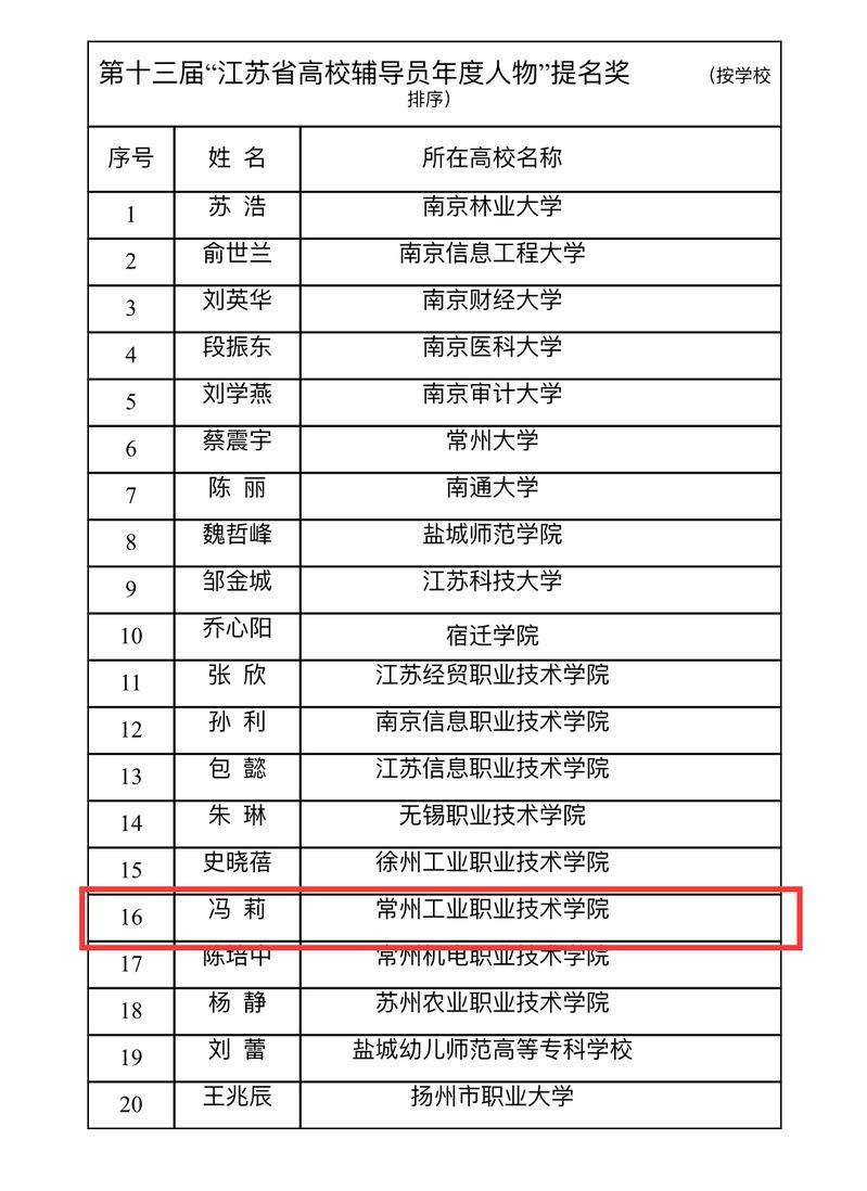 近日,江蘇省教育廳公布2023年度全省高校“年度輔(fǔ)導員”“年度大學生”推選活動結果,常州工業職業技術學院機械與交通學院專職(zhí)輔導員(yuán)馮莉獲2023年度省(shěng)高校“年度輔導員”提名獎,數字商務學院學生王凱歌獲2023年度省高(gāo)校“年度大學生”提名獎(jiǎng)。